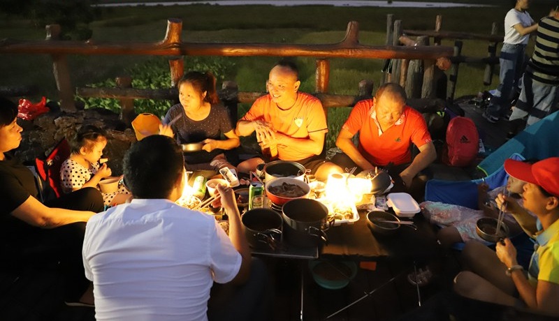 游客在湿地公园搭帐篷畅聊
