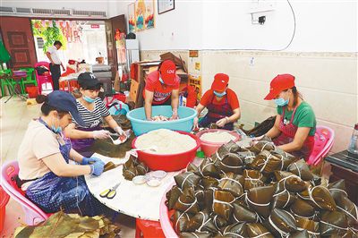 6月4日,在儋州市那大镇幸福街139号粽子铺里,一张桌子上,摆放着一大盆五花肉、一大筐糯米、一大盆黄橙橙的咸鸭蛋黄,5个妇女围着桌子,有的拣肉,有的分粽叶,有的包粽子,有的绑粽子,不停地忙碌。这家粽子铺经营梁氏粽子,生产红豆粽、鱼鳔粽、虾米粽、碱水粽、排骨蛋粽、猪脚蛋粽等,大部分粽子都销往海口、三亚以及省外的北京、深圳等地。采用本地跑海鸭蛋、海鲜干货、黑猪肉等食材,粽子除了保留儋州粽子传统风味外,肉馅则选用猪脚、排骨、猪腿肉或者五花肉。包粽子的过程特别注重卫生,让消费者放心购买。该粽子铺经营者梁春介绍,截至6月4日,订单已突破10万个粽子。